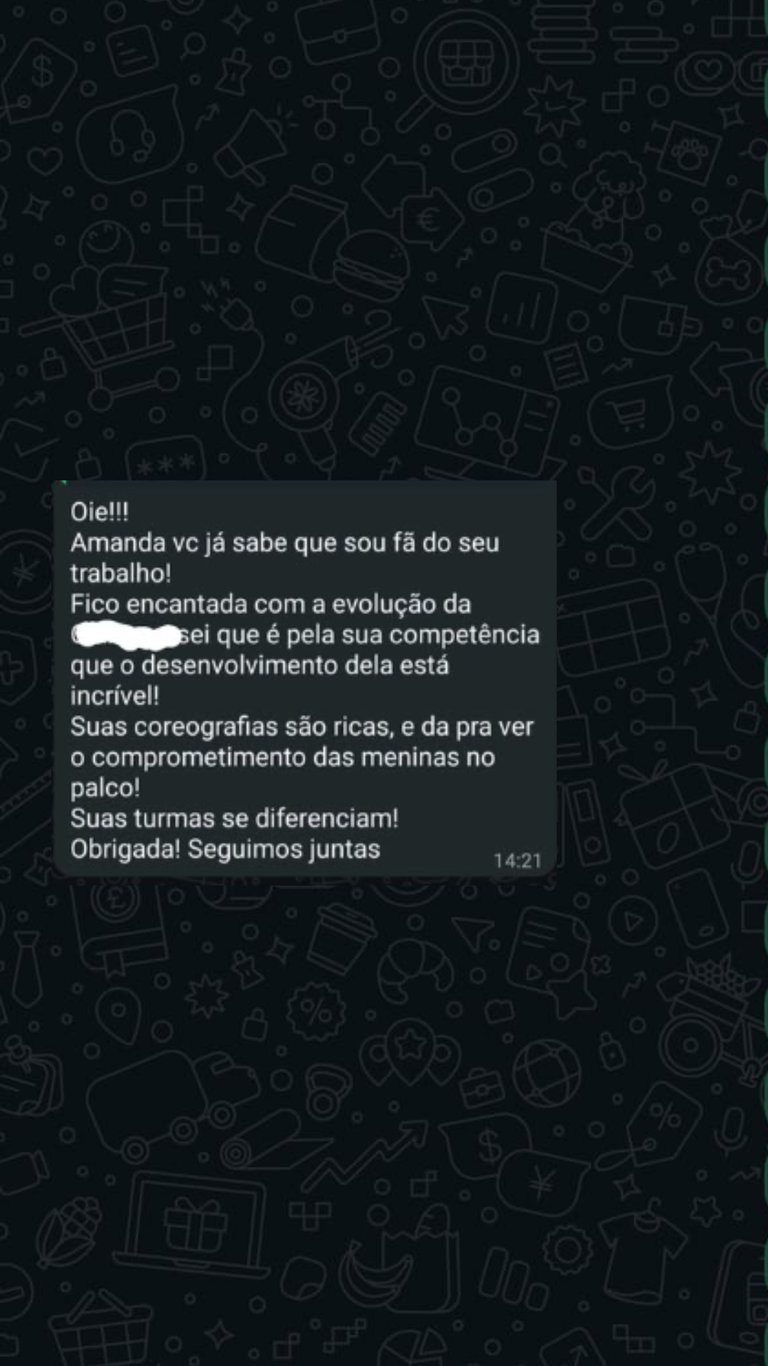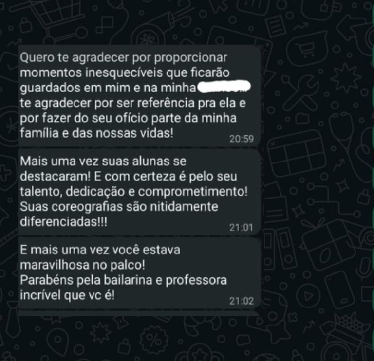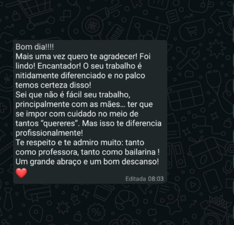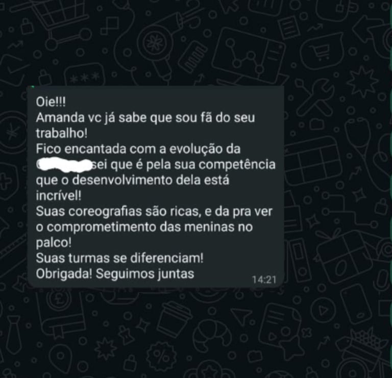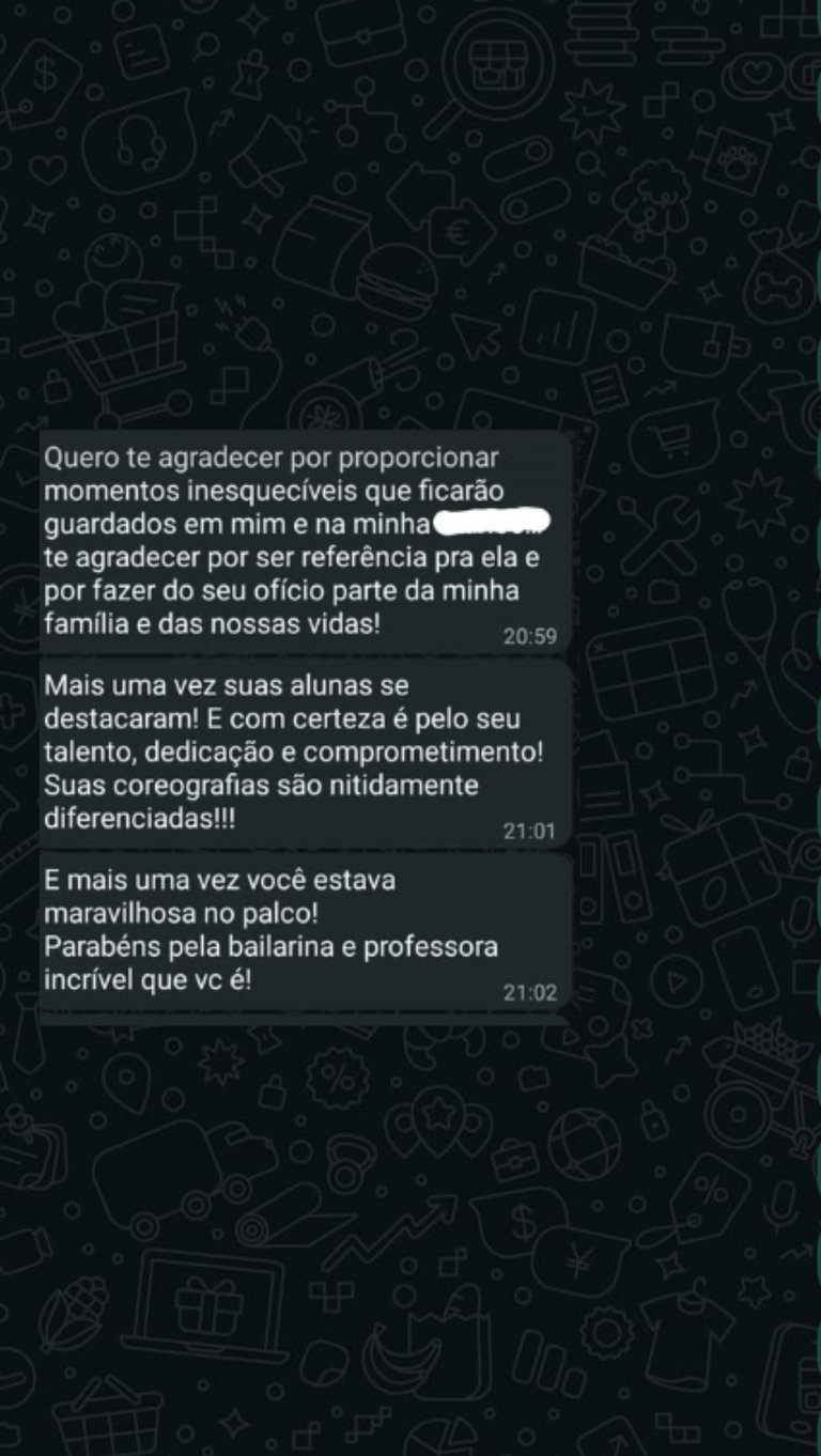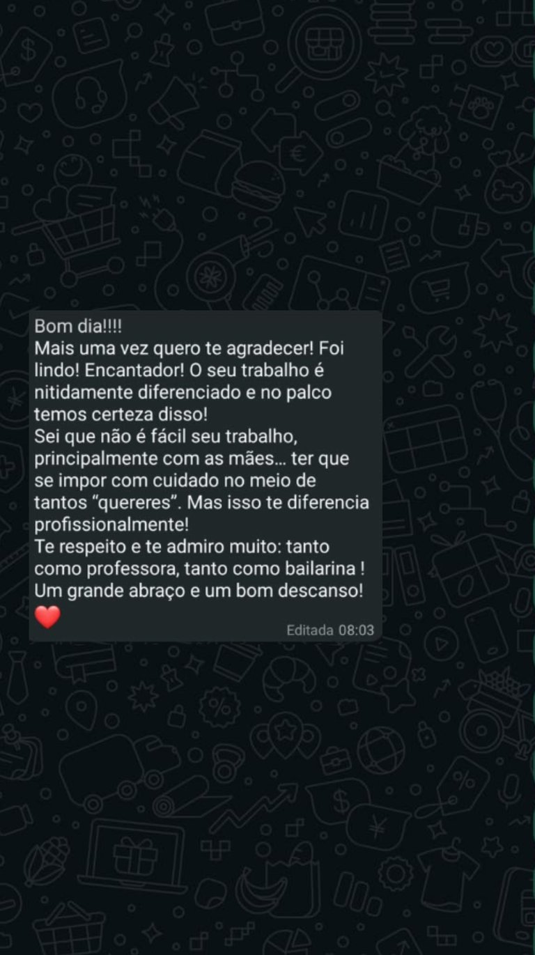 Iniciei meus estudos em ballet no atual famoso Teatro Escola Basileu França, passei por escolas menores e também pelo renomado Mvsika Centro de Estudos. Ao longo da minha trajetória, participei de diversas competições e espetáculos, experiências que contribuíram para minha formação artística e para minha compreensão do palco como parte do processo educativo.